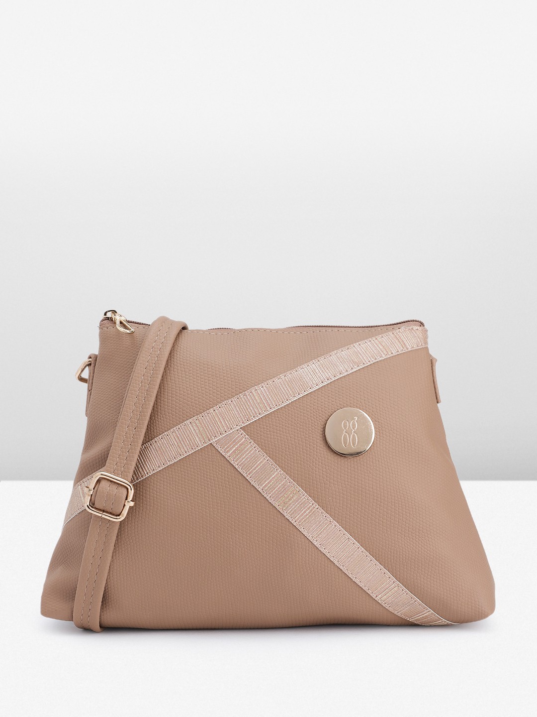 Beige solid sling bag, 1 main compartment has a zip closure, 1 external pocket, 1 inner pocket, Non-detachable sling strap